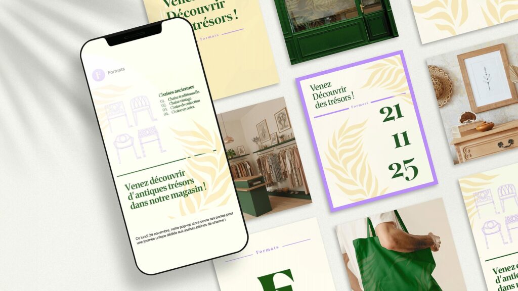 Formats s’adresse à une clientèle de passionnés d’objets anciens et rares. Dans ce pop up store, vous avez la possibilité de dénicher de véritables trésors ! C’est ce qui le rend aussi unique. Ainsi l’identité visuelle s’inspire de la décoration Art nouveau du pop up store. J’ai développé une identité qui reflète l’image de la marque tout en restant moderne.